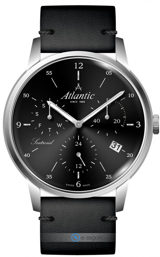 Model 65550.41.65 marki Atlantic to stylowy zegarek naręczny męski, który wyposażono w ciekawe rozwiązania i funkcje. Ciekawy wygląd zegarka osiągnięto m.in. poprzez cyferblat w kolorze czarnym. Godzina przedstawiona jest w sposób analogowy co intuicyjnie pozwala ją odczytać. Koperta w odcieniach koloru srebrnego szeroka jest na 41 mm oraz ma grubość 11 mm - w kształcie okrągłym.