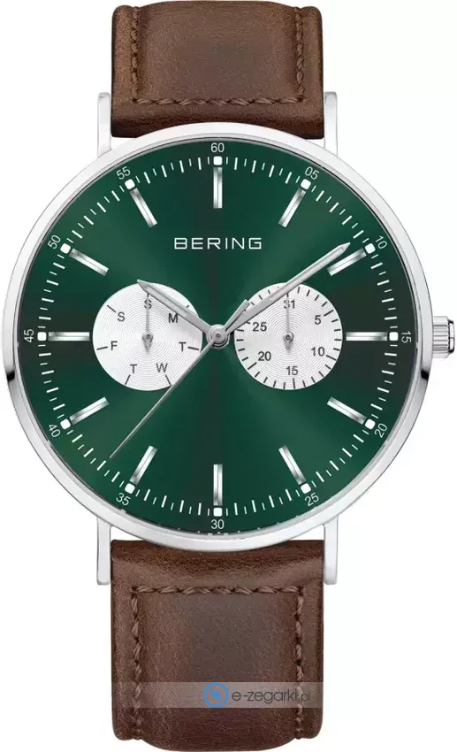 Zegarek męski 14240-508 marki Bering to dobre połączenie funkcjonalności oraz ciekawego designu. Model ten w gamie pozostałych zegarków tego producenta występuje w serii Bering Classic. Wysokiej trwałości cyferblat zegarka ozdobiono zielonym kolorem. Zaprezentowana metodą analogową bieżąca godzina jest czytelna i szybka do odczytania. Koperta jest ozdobiona kolorem stalowym szeroka jest na 40 mm - w kształcie okrągłym.