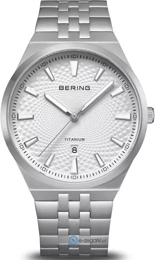 Męski zegarek 16141-704 z serii Bering Titanium marki Bering to połączenie estetyki i pomysłowych mechanizmów. Cyferblat zegarka jest w kolorze białym. Aktualna godzina zaprezentowana jest w sposób analogowy co intuicyjnie pozwala ją odczytać. Koperta jest w kolorze stalowym szeroka jest na 41 mm oraz ma grubość 8 mm - cechuje się okrągłym kształtem.