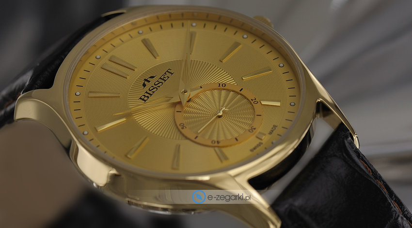 Model BSCC70GIGX marki Bisset to elegancki zegarek naręczny męski, który posiada pomysłowe rozwiązania i funkcje. Wysokiej jakości cyferblat zegarka ozdobiono złotym kolorem. Aktualna godzina pokazywana jest w sposób analogowy co intuicyjnie pozwala ją odczytać. Koperta w barwach koloru złotego szeroka jest na 40 mm - charakteryzuje się okrągłym kształtem.