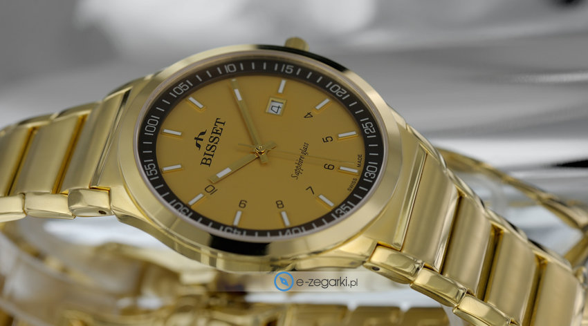 Męski zegarek Bisset BSDC86GIGX03BX to zegarek, który dzięki swemu wzornictwu zawsze będzie prezentował się dobrze. Charakterystyczny wygląd czasomierza uzyskano także dzięki tarczy w kolorze złotym. Zaprezentowana metodą analogową bieżąca godzina jest czytelna i prosta do odczytania. Koperta została pokryta kolorem złotym szeroka jest na 40 mm - charakteryzuje się okrągłym kształtem.