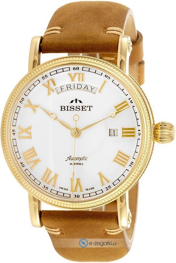 Model BSMF35GRWX05BX marki Bisset to gustowny zegarek naręczny męski, który posiada ciekawe rozwiązania oraz funkcje. Charakteru dodaje wysokiej jakości cyferblat w kolorze białym. Aktualna godzina zaprezentowana jest w sposób analogowy co bez trudu pozwala ją odczytać. Koperta jest pokryta kolorem złotym szeroka jest na 42 mm oraz ma grubość 13 mm - charakteryzuje się okrągłym kształtem.