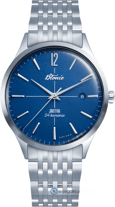 Zegarek męski Jantar Burza marki Błonie to dobre połączenie funkcjonalności i modnego wzornictwa. Atrakcyjny wygląd czasomierza osiągnięto m.in. poprzez cyferblat w kolorze niebieskim. Pokazana metodą analogową bieżąca godzina jest czytelna i łatwa do odczytania. Koperta została pokryta kolorem srebrnym szeroka jest na 40 mm oraz ma grubość 10 mm - posiada okrągły kształt.