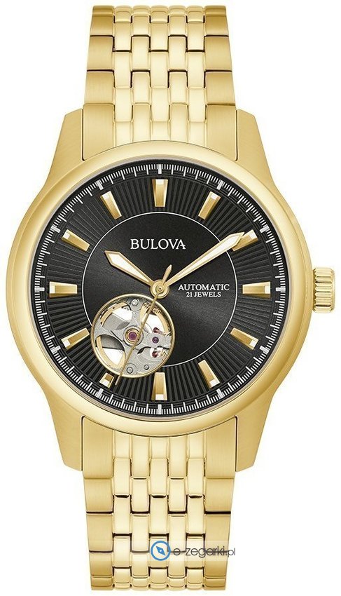 Zegarek męski 97A168 marki Bulova to stylowe połączenie funkcjonalności i ciekawego wzornictwa. Wysokiej jakości tarczę zegarka pokryto czarnym kolorem. Zegarek ten prezentuje godzinę w formacie analogowym dzięki temu odczyt jest bardzo łatwy. Koperta jest pokryta kolorem złotym szeroka jest na 40 mm oraz ma grubość 12 mm - wyróżnia się okrągłym kształtem.
