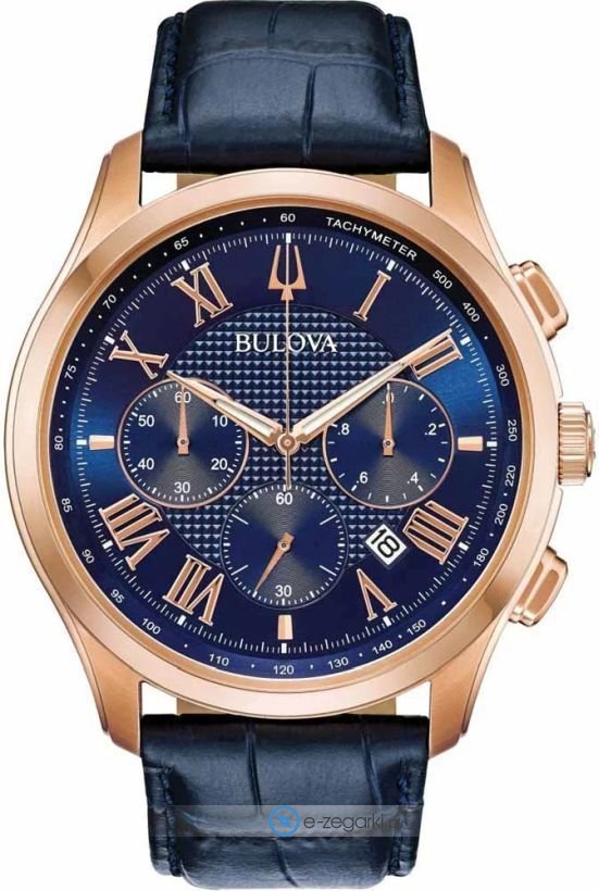 Model 97B170 marki Bulova to gustowny zegarek naręczny męski, który wyposażono w ciekawe rozwiązania oraz funkcje. Cyferblat zegarka jest w kolorze niebieskim. Zaprezentowana metodą analogową aktualna godzina jest czytelna i łatwa do sprawdzenia. Koperta w odcieniach koloru różowo złotego szeroka jest na 47 mm oraz ma grubość 13 mm - charakteryzuje się okrągłym kształtem.