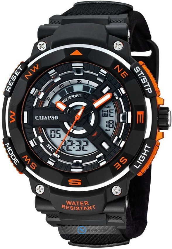 Model K5673-1 marki Calypso to stylowy zegarek naręczny męski, który jest wyposażony w ciekawe rozwiązania oraz funkcje. Charakterystyczny wygląd czasomierza osiągnięto poprzez tarczę w kolorze czarnym. Koperta szeroka jest na 51 mm - posiada okrągły kształt.