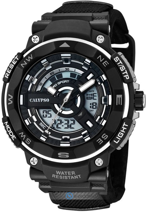 Model K5673-4 marki Calypso to stylowy zegarek naręczny męski, który posiada pomysłowe rozwiązania i funkcje. Stylu nadaje wysokiej jakości cyferblat w kolorze czarnym. Godzina przedstawiona jest w sposób analogowo - cyfrowy co intuicyjnie pozwala ją odczytać. Koperta szeroka jest na 51 mm - ma okrągły kształt.