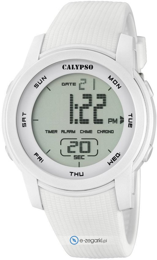 Model K5698-1 marki Calypso to elegancki zegarek naręczny męski, który wyposażono w ciekawe rozwiązania oraz funkcje. Wysokiej trwałości tarczę zegarka ozdobiono białym kolorem. Zegarek ten prezentuje godzinę w formacie cyfrowym dzięki temu odczyt jest bezproblemowy. Koperta szeroka jest na 45 mm - wyróżnia się okrągłym kształtem.