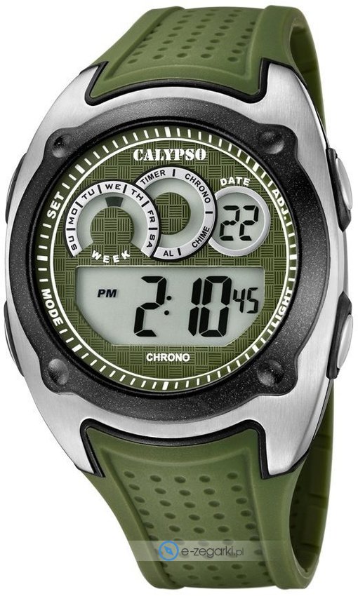 Model K5722-2 marki Calypso to elegancki zegarek naręczny męski, który jest wyposażony w ciekawe rozwiązania oraz funkcje. Stylu dodaje wysokiej klasy tarcza w kolorze zielonym. Koperta szeroka jest na 42 mm - cechuje się okrągłym kształtem.