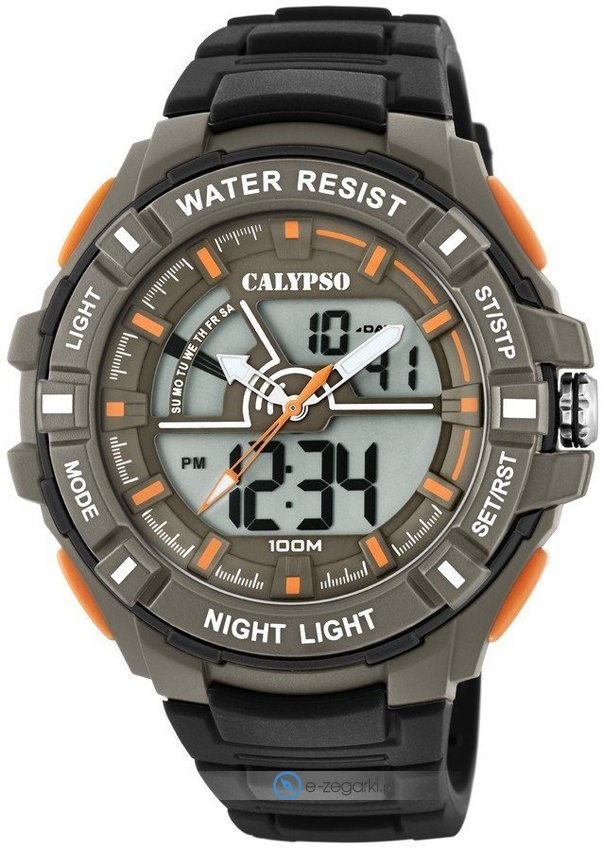Model K5769-1 marki Calypso to gustowny zegarek naręczny męski, który posiada ciekawe rozwiązania oraz funkcje. Atrakcyjną stylistykę czasomierza osiągnięto dzięki tarczy w kolorze brązowym. Zegarek ten pokazuje aktualny czas w formacie analogowo - cyfrowym dzięki czemu odczyt jest bardzo łatwy. Koperta szeroka jest na 54 mm - cechuje się okrągłym kształtem.