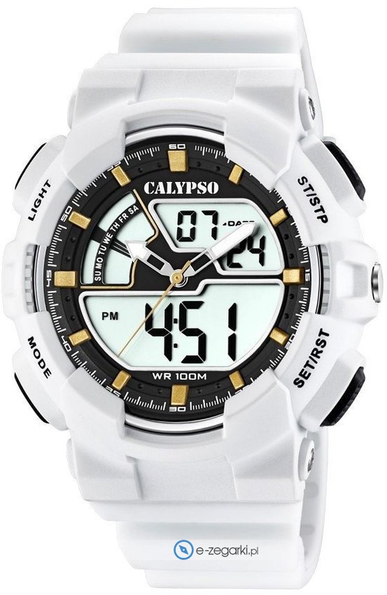 Zegarek męski K5771-1 marki Calypso to dobre połączenie funkcjonalności oraz ciekawego wzornictwa. Stylu dodaje wysokiej klasy tarcza w kolorze białym. Koperta szeroka jest na 50 mm - posiada okrągły kształt.