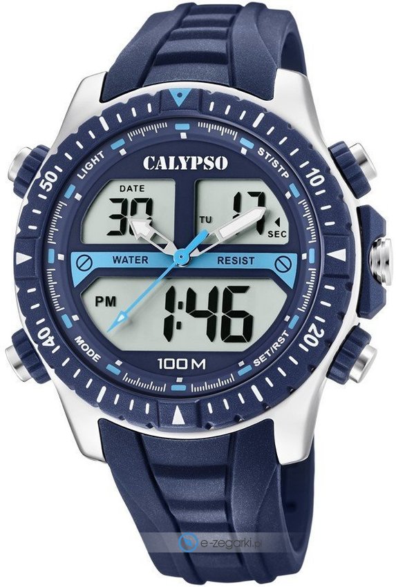 Model K5773-2 marki Calypso to elegancki zegarek naręczny męski, który jest wyposażony w pomysłowe rozwiązania i funkcje. Wysokiej jakości cyferblat zegarka ozdobiono niebieskim kolorem. Koperta szeroka jest na 47 mm - cechuje się okrągłym kształtem.