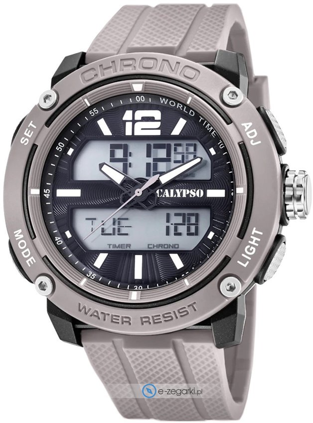 Model K5796-1 marki Calypso to elegancki zegarek naręczny męski, który wyposażono w pomysłowe rozwiązania i funkcje. Zegarek ten prezentuje godzinę w formacie analogowo - cyfrowym dzięki czemu odczyt jest bezproblemowy. Koperta w odcieniach koloru szarego szeroka jest na 52 mm - posiada okrągły kształt.
