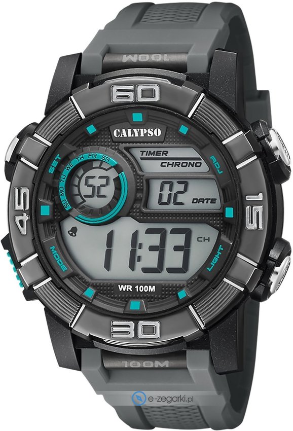 Model K5818-1 marki Calypso to elegancki zegarek naręczny męski, który wyposażono w ciekawe rozwiązania i funkcje. Ciekawą konstrukcję czasomierza uzyskano dzięki tarczy w kolorze szarym. Zegarek ten prezentuje aktualny czas w formacie cyfrowym dzięki temu odczyt jest bardzo łatwy. Koperta szeroka jest na 35 mm - w kształcie okrągłym.