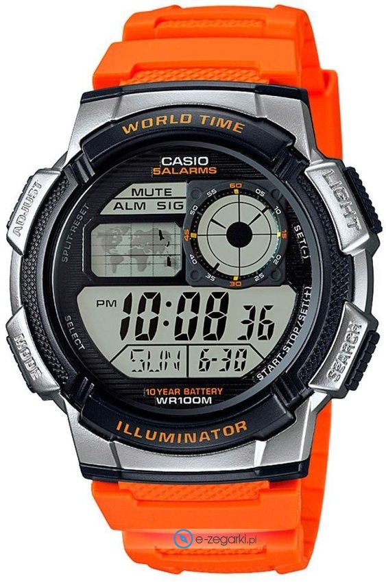 Zasilanie zegarka AE-1000W-4BV to klasyczna bateria kwarcowa. Pasek w odcieniach koloru pomarańczowego zrobiony jest z wysokiej jakości tworzywa sztucznego.