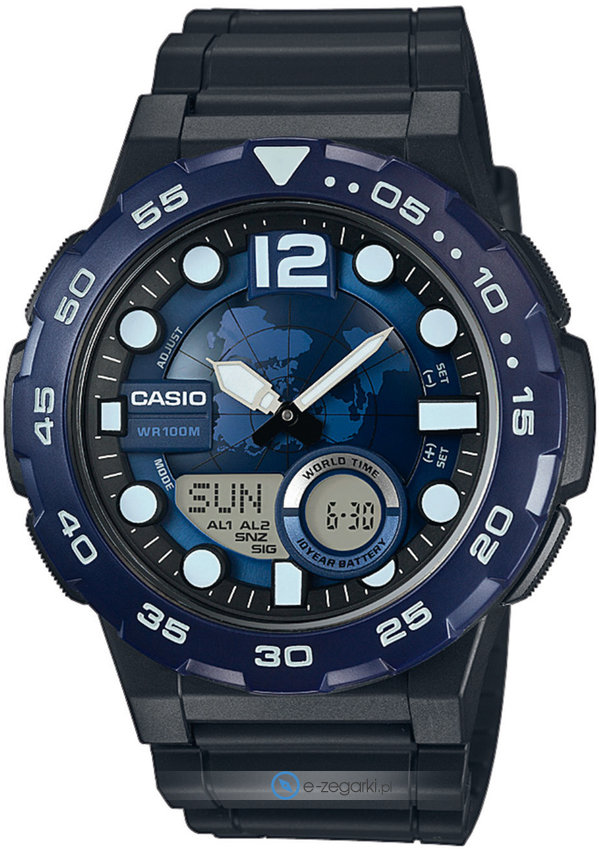 Zegarek męski AEQ-100W-2AVEF marki Casio należy do rodziny Casio Collection. Nieschematyczny wygląd czasomierza uzyskano również dzięki tarczy w kolorze niebieskim. Zegarek ten pokazuje aktualny czas w formacie analogowo - cyfrowym dzięki temu odczyt jest bardzo łatwy. Koperta szeroka jest na 47 mm oraz ma grubość 15 mm.