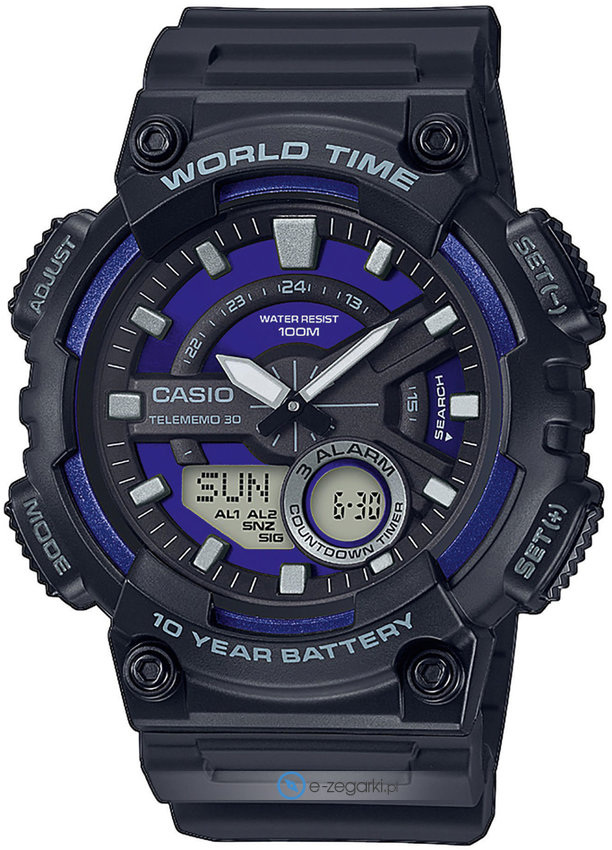 Model męski AEQ-110W-2A2VEF marki Casio z serii Casio Collection. Godzina pokazywana jest w sposób analogowo - cyfrowy co niezmiernie łatwo pozwala ją odczytać. Koperta jest w kolorze czarnym szeroka jest na 47 mm oraz ma grubość 16 mm - ma okrągły kształt.