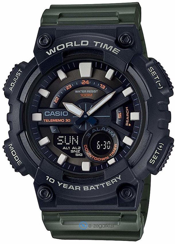 Zegarek AEQ-110W-3AVEF wyposażony jest w mechanizm zasilany normalną baterią kwarcową. Pasek wykonany jest z wysokiej jakości tworzywa sztucznego.