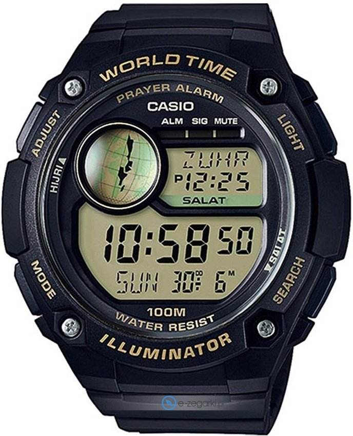 Podświetlenie diodą elektroluminescencyjną (LED). WR 100 oznacza, że zegarek odporny jest na swobodne zanurzenie w wodzie, pływanie oraz nurkowanie z rurką - snorkeling, czyli bez akwalungu. Posiada funkcję czasu światowego przez co pokazuje czas w różnych strefach czasowych na podstawie informacji z największych miast na świecie.