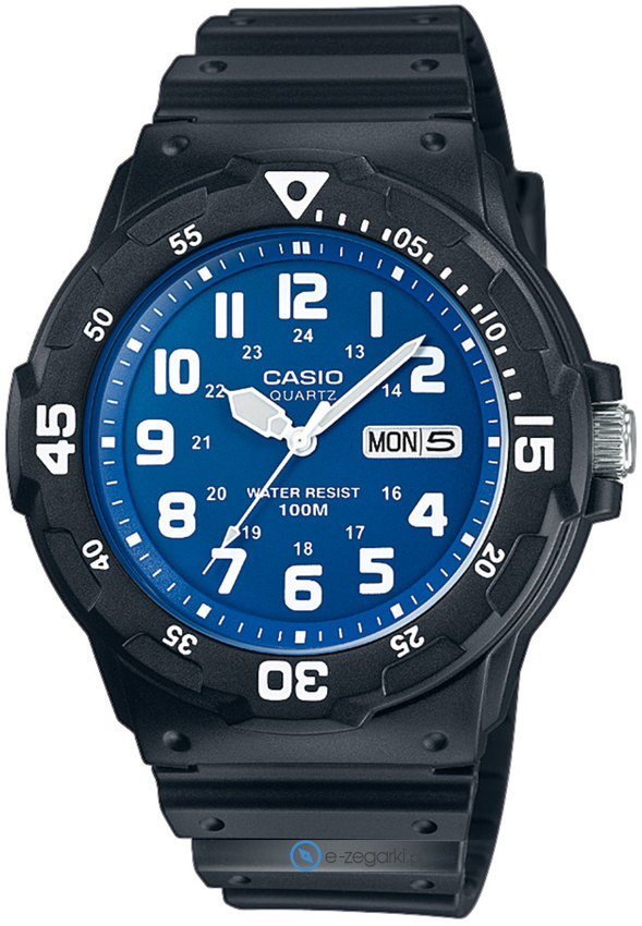 Zegarek MRW-200H-2B2VEF marki Casio to stylowy zegarek naręczny męski, który wyposażono w ciekawe rozwiązania oraz funkcje. Model ten zalicza się do Casio Collection. Charakter zapewnia wysokiej jakości cyferblat w kolorze niebieskim. Godzina przedstawiona jest w sposób analogowy co intuicyjnie pozwala ją odczytać. Koperta w odcieniach koloru czarnego szeroka jest na 45 mm oraz ma grubość 12 mm - cechuje się okrągłym kształtem.