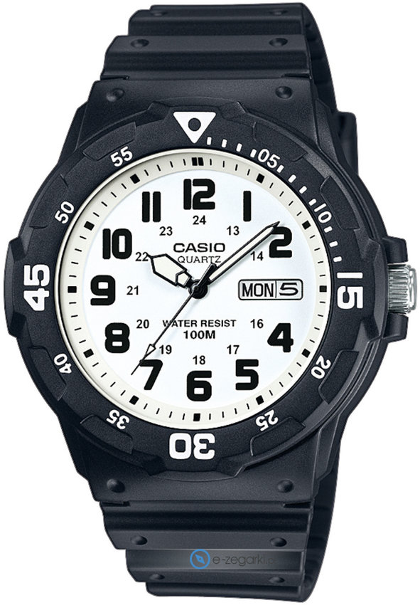 Casio MRW-200H-7BVEF to męski zegarek kierowany dla osób szukających zegarka z rodziny Casio Collection. Niebanalny wygląd czasomierza uzyskano również dzięki tarczy w kolorze białym. Zegarek ten prezentuje aktualny czas w formacie analogowym dzięki czemu odczyt jest bezproblemowy. Koperta w barwach koloru czarnego szeroka jest na 47 mm oraz ma grubość 11 mm - posiada okrągły kształt.