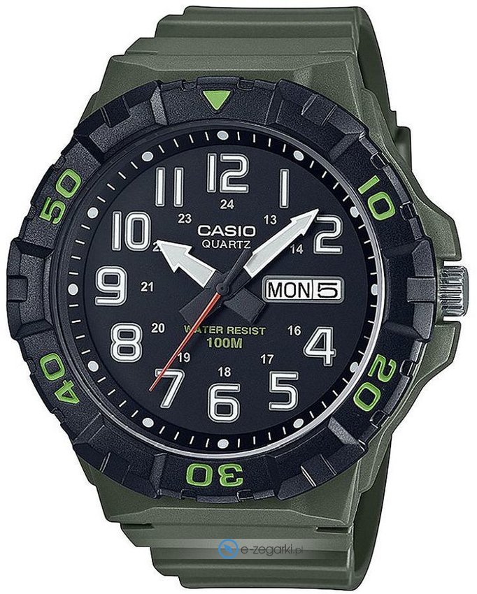 Kwarcowa bateria umieszczona w zegarku MRW-210H-3AVEF zapewnia zasilanie jego mechanizmu. Pasek jest w kolorze zielonym wykonany jest z wysokiej jakości tworzywa sztucznego.