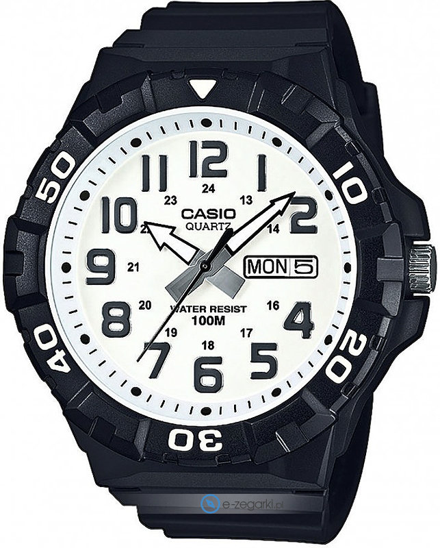 Zegarek MRW-210H-7AVEF marki Casio to gustowny zegarek naręczny męski, który jest wyposażony w ciekawe rozwiązania i funkcje. Model ten jest z kolekcji Casio Collection. Ciekawą budowę czasomierza uzyskano dzięki tarczy w kolorze białym. Pokazana metodą analogową aktualna godzina jest czytelna i prosta do odczytania. Koperta szeroka jest na 53 mm oraz ma grubość 13.7 mm.