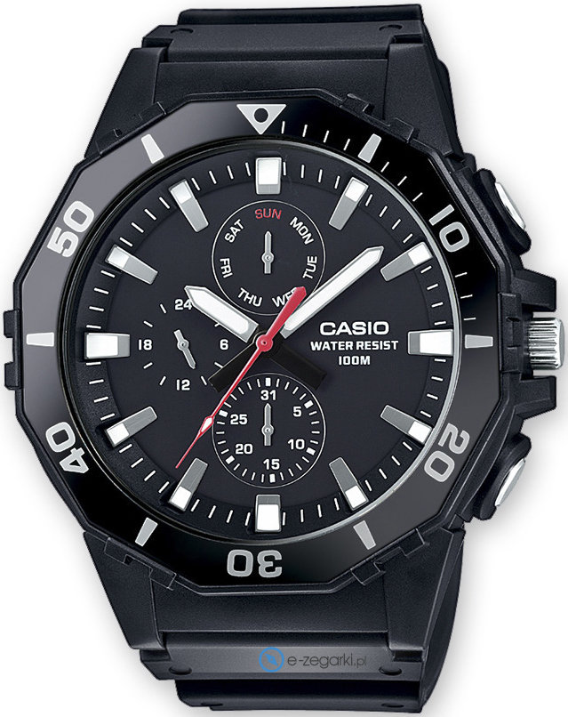 Model męski MRW-400H-1AVEF z rodziny Casio Collection marki Casio. Stylu nadaje wysokiej jakości tarcza w kolorze czarnym. Godzina przedstawiona jest w sposób analogowy co bez trudu pozwala ją odczytać. Koperta szeroka jest na 52 mm oraz ma grubość 18 mm.
