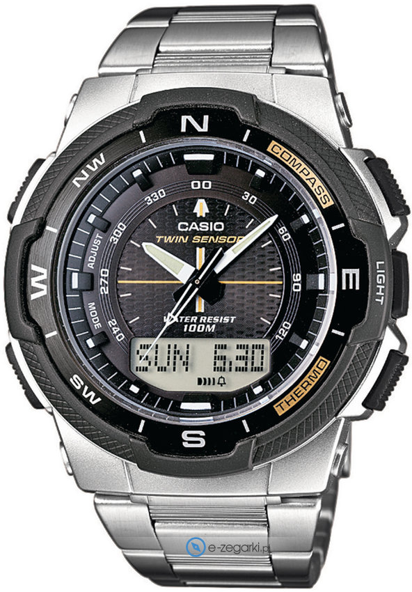 Dodatkowo zegarek Casio SGW-500HD-1BVER jest wyposażony w funkcje takie jak kompas, który dobrze sprawdza się w czasie podróży wskazując kierunki geograficzne: północ, południe, wschód, zachód oraz termometr wskazujący bieżącą temperaturę w stopniach celcjusza oraz fahrenheita.
