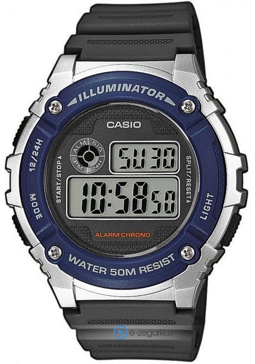 Zegarek męski W-216H-2AVEF marki Casio z kolekcji Casio Collection. Wysokiej trwałości cyferblat zegarka ozdobiono czarnym kolorem. Aktualna godzina zaprezentowana jest w sposób cyfrowy co bez trudu pozwala ją odczytać. Koperta jest w kolorze niebieskim szeroka jest na 43 mm oraz ma grubość 11 mm - charakteryzuje się okrągłym kształtem.