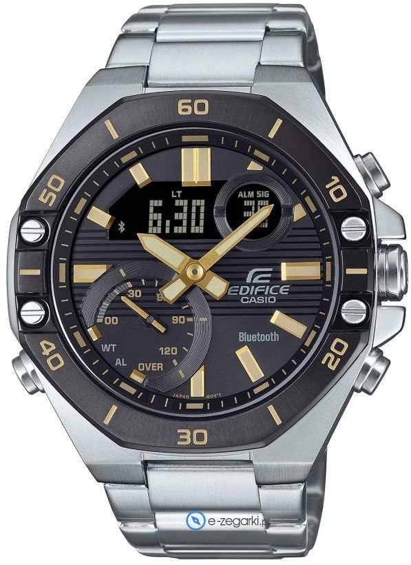 Zegarek męski ECB-10DB-1A9EF z serii Casio Edifice marki Casio. Ciekawą stylistykę zegarka uzyskano dzięki tarczy w kolorze czarnym. Aktualna godzina zaprezentowana jest w sposób analogowo - cyfrowy co intuicyjnie pozwala ją odczytać. Koperta jest pokryta kolorem srebrnym szeroka jest na 45 mm oraz ma grubość 12 mm - w kształcie okrągłym.