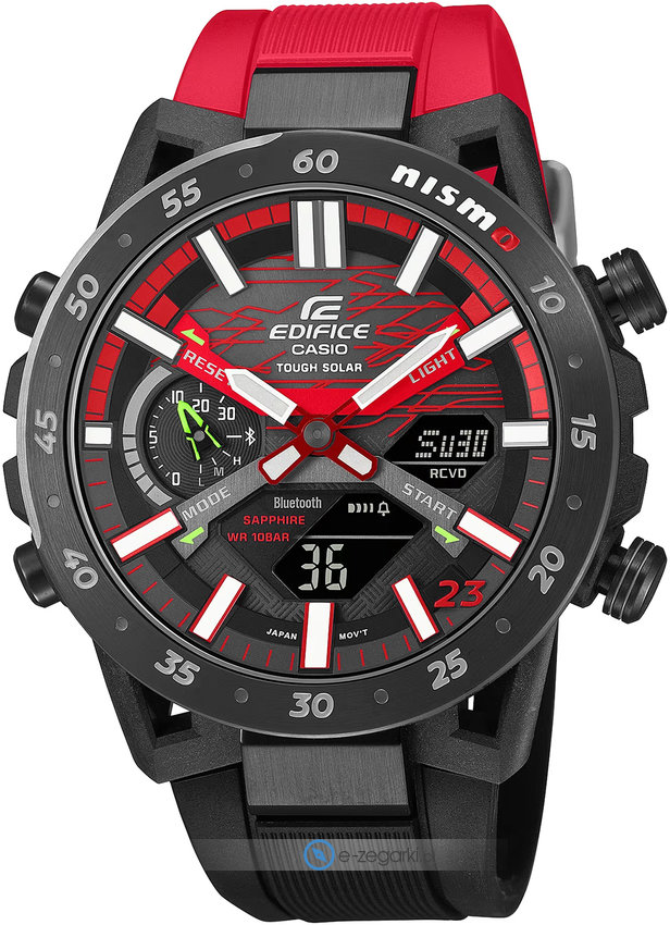 Zegarek ten to tzw Smartwatch - posiada segment Smart umożliwiający połączenie zegarka ze smartfonem i obsługę dodatkowych opcji z pomocą specjalnej aplikacji zainstalowanej w telefonie. Zegarek ECB-2000NIS-1AER Nismo posiada mechanizm solarny zasilany jakimkolwiek źródłem światła.