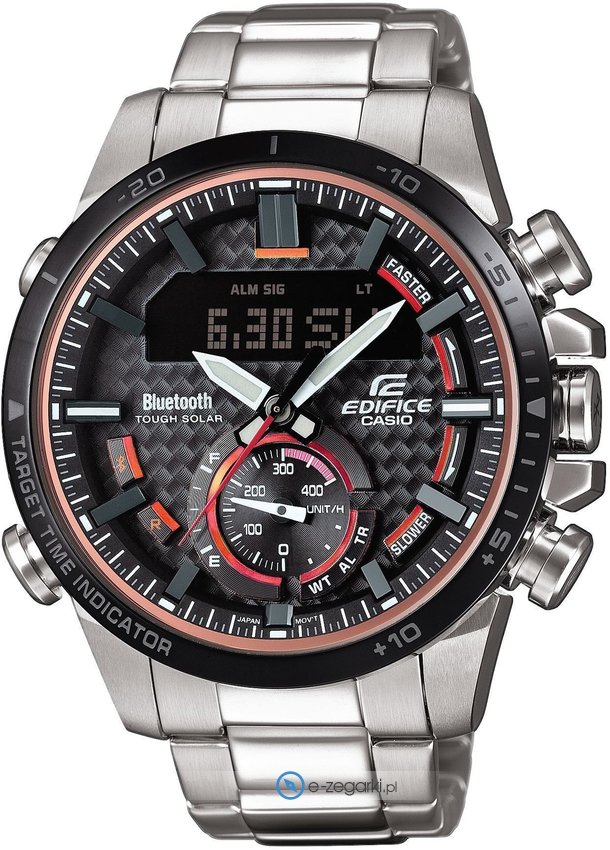 Smartwatch - zastosowanie nowoczesnej technologii Smart powoduje, że zegarek ten ma jednak więcej możliwości niż przeciętny zegarek, wszystko dzięki integracji z telefonem. Po zainstalowaniu aplikacji dostarczanej przez producenta w telefonie mamy do dyspozycji dodatkowe funkcje zegarka. W zegarku ECB-800DB-1AEF zastosowano mechanizm solarny zasilany jakimkolwiek źródłem światła.