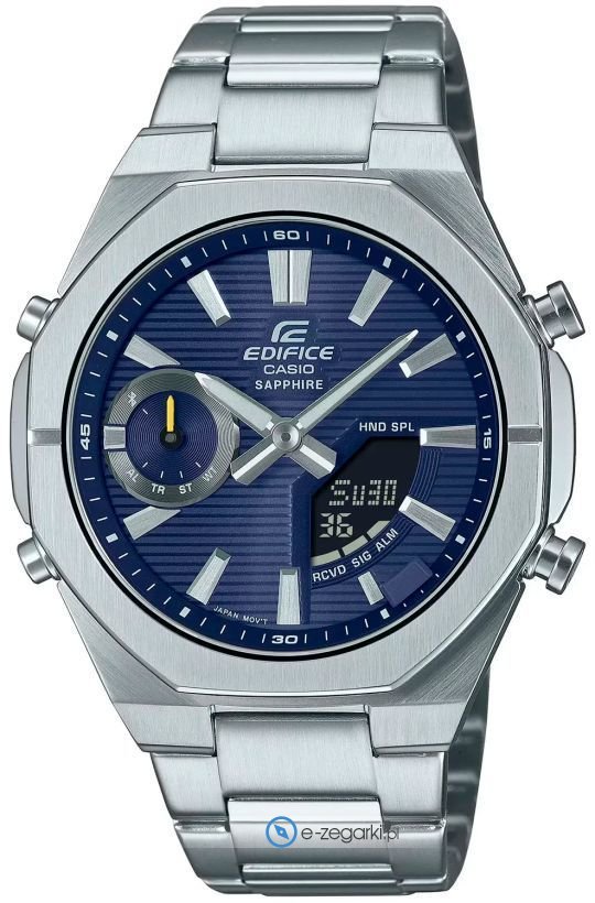 Męski zegarek ECB-S10D-2AEF z serii Casio Edifice marki Casio to połączenie estetyki oraz ciekawych funkcji. Cyferblat zegarka jest w kolorze niebieskim. Zaprezentowana metodą analogowo - cyfrową bieżąca godzina jest czytelna i łatwa do odczytania. Koperta w odcieniach koloru srebrnego szeroka jest na 46 mm oraz ma grubość 10 mm - w kształcie okrągłym.