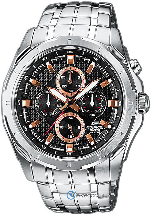 Casio EF-328D-1A5 to męski zegarek kierowany dla osób szukających zegarka z rodziny Casio Edifice. Ciekawą stylistykę zegarka osiągnięto z pomocą tarczy w kolorze czarnym. Zaprezentowana metodą analogową bieżąca godzina jest czytelna i łatwa do odczytania. Koperta w barwach koloru srebrnego szeroka jest na 43 mm oraz ma grubość 10 mm - cechuje się okrągłym kształtem.