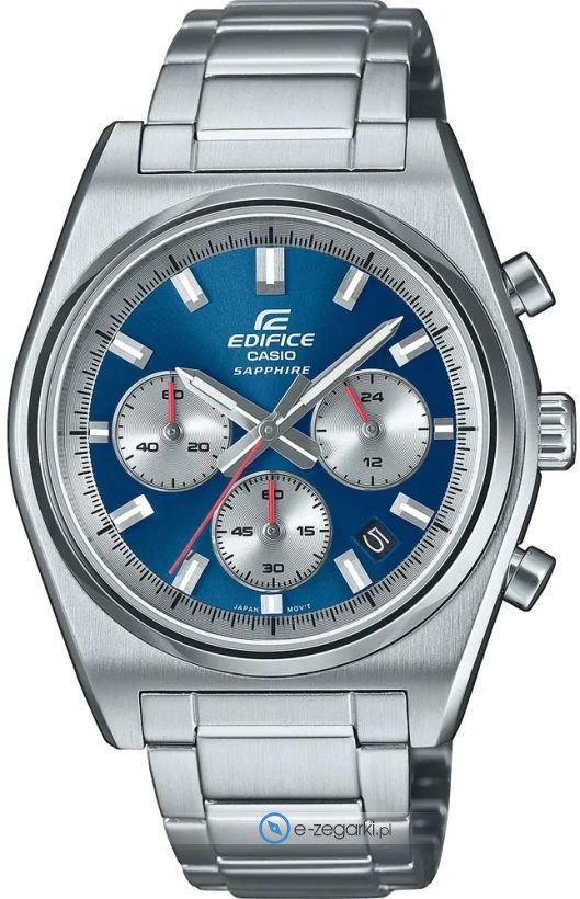 Zegarek męski EFB-730D-2AVUEF zalicza się do serii Casio Edifice marki Casio. Ciekawy wygląd czasomierza osiągnięto m.in. poprzez tarczę w kolorze niebieskim. Zegarek ten prezentuje aktualny czas w formacie analogowym dzięki czemu odczyt jest bezproblemowy. Koperta została pokryta kolorem srebrnym szeroka jest na 40 mm oraz ma grubość 11 mm - w kształcie okrągłym.