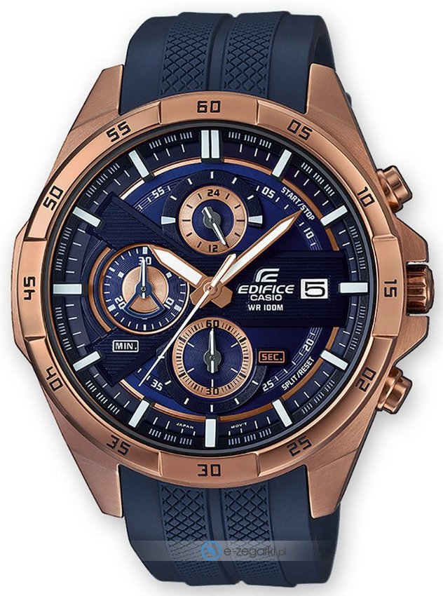 Zegarek EFR-556PC-2AVUEF posiada kwarcowy mechanizm zasilany tradycyjną baterią. Pasek koloru granatowego zrobiony jest z wysokiej jakości tworzywa sztucznego.