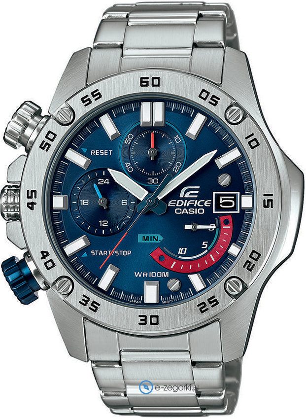 Zasilanie zegarka EFR-558D-2AVUEF to normalna bateria kwarcowa. Wytrzymała bransoleta srebrnego koloru wykonana ze stali nierdzewnej gwarantuje wysoką jakość i trwałość.
