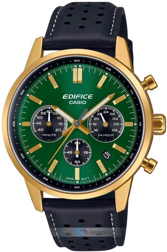 Model męski EFR-575CL-3AEF marki Casio należy do kolekcji Casio Edifice. Niestereotypowy wygląd czasomierza uzyskano także dzięki tarczy w kolorze zielonym. Zegarek ten pokazuje aktualny czas w formacie analogowym dzięki temu odczyt jest intuicyjny. Koperta jest w kolorze złotym szeroka jest na 40 mm oraz ma grubość 47.9 mm - ma okrągły kształt.