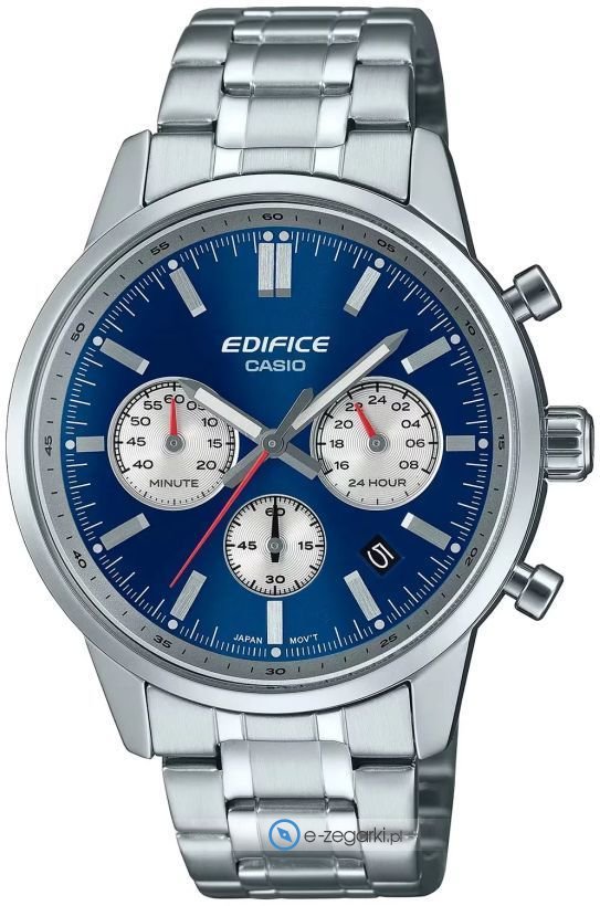 Casio EFR-575D-2AEF - męski zegarek przeznaczony dla osób szukających zegarka z kolekcji Casio Edifice. Charakterystyczną stylistykę zegarka uzyskano z pomocą tarczy w kolorze niebieskim. Zegarek ten pokazuje aktualny czas w formacie analogowym dzięki temu odczyt jest intuicyjny. Koperta została ozdobiona kolorem srebrnym szeroka jest na 40 mm oraz ma grubość 47.9 mm - wyróżnia się okrągłym kształtem.