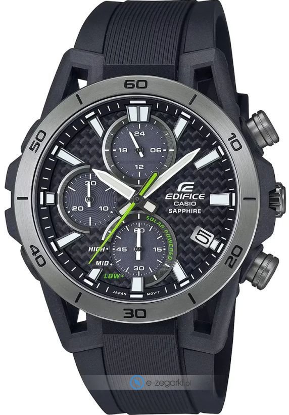 Zegarek EFS-S640PB-1AVUEF został wyposażony w mechanizm solarny zasilany jakimkolwiek źródłem światła. Pasek czarnego koloru wykonany jest z wysokiej jakości tworzywa sztucznego.