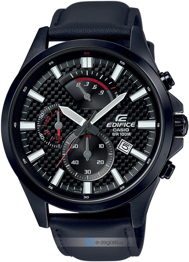 Zegarek męski EFV-530BL-1AVUEF marki Casio należy do kolekcji Casio Edifice. Charakterystyczną konstrukcję czasomierza uzyskano dzięki tarczy w kolorze czarnym. Zaprezentowana metodą analogową aktualna godzina jest czytelna i szybka do odczytania. Koperta szeroka jest na 47 mm oraz ma grubość 12 mm - posiada okrągły kształt.