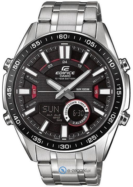 Model męski EFV-C100D-1AVEF należy do kolekcji Casio Edifice marki Casio. Niestereotypowy wygląd czasomierza uzyskano także dzięki tarczy w kolorze czarnym. Godzina zaprezentowana jest w sposób analogowo - cyfrowy co niezmiernie łatwo pozwala ją odczytać. Koperta została ozdobiona kolorem srebrnym szeroka jest na 45 mm oraz ma grubość 14.2 mm - cechuje się okrągłym kształtem.