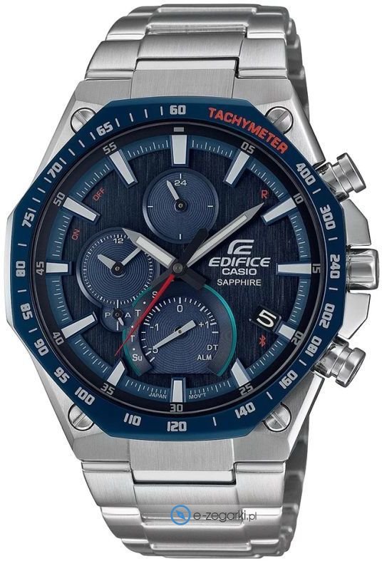 Zegarek męski EQB-1100XDB-2AER marki Casio to idealne połączenie funkcjonalności a także modnego designu. Model ten w gamie innych zegarków tego producenta występuje w kolekcji Casio Edifice. Ciekawą konstrukcję czasomierza uzyskano z pomocą tarczy w kolorze niebieskim. Zaprezentowana metodą analogową aktualna godzina jest czytelna i prosta do sprawdzenia. Koperta jest pokryta kolorem srebrnym szeroka jest na 44 mm oraz ma grubość 9 mm - posiada okrągły kształt.