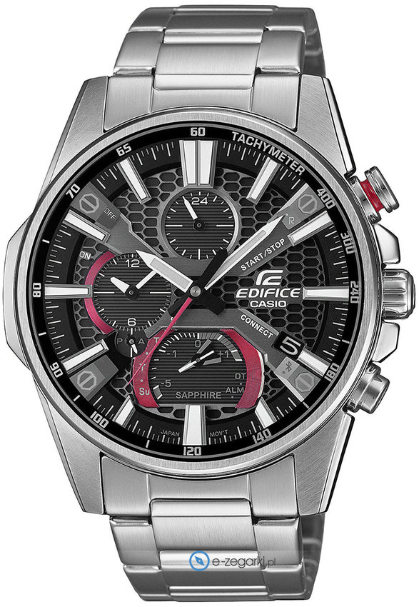 Zegarek męski EQB-1200D-1AER marki Casio to stylowe połączenie funkcjonalności i ciekawego wzornictwa. Model ten w gamie pozostałych zegarków tego producenta występuje w serii Casio Edifice. Cyferblat zegarka jest w kolorze czarnym. Aktualna godzina zaprezentowana jest w sposób analogowy co bez trudu pozwala ją odczytać. Koperta jest w kolorze srebrnym szeroka jest na 45 mm oraz ma grubość 10 mm - posiada okrągły kształt.