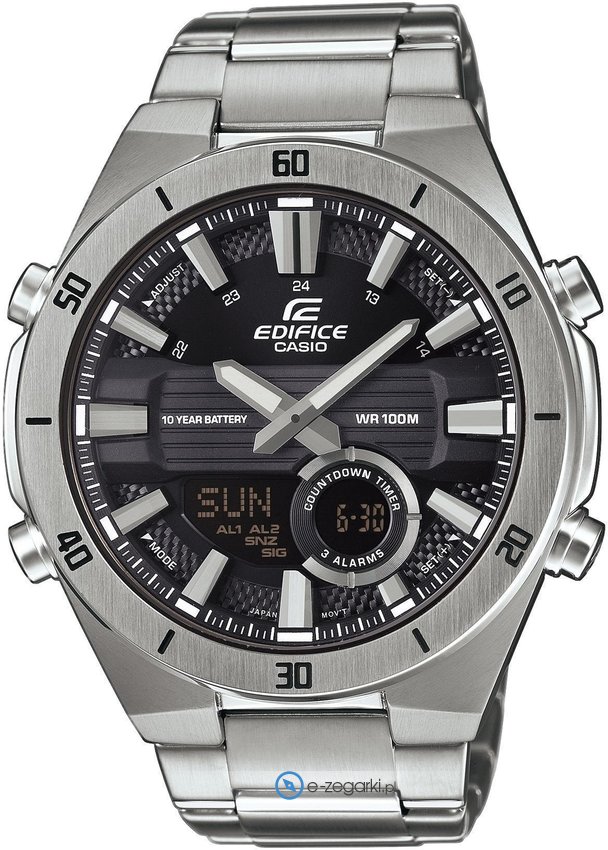 Zegarek męski ERA-110D-1AVEF marki Casio to stylowe połączenie funkcjonalności i ciekawego designu. Model ten jest z kolekcji Casio Edifice. Charakterystyczną stylistykę zegarka osiągnięto z pomocą tarczy w kolorze czarnym. Pokazana metodą analogowo - cyfrową aktualna godzina jest czytelna i szybka do sprawdzenia. Koperta jest w kolorze srebrnym szeroka jest na 47.6 mm oraz ma grubość 14.2 mm - w kształcie okrągłym.