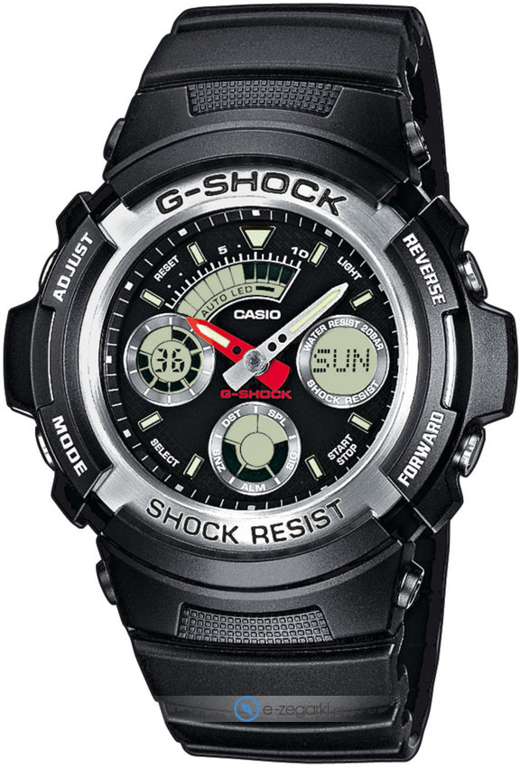 Zegarek męski AW-590-1AER z serii Casio G-Shock marki Casio. Wysokiej trwałości cyferblat zegarka ozdobiono czarnym kolorem. Pokazana metodą analogowo - cyfrową aktualna godzina jest czytelna i łatwa do sprawdzenia. Koperta w odcieniach koloru czarnego szeroka jest na 46 mm oraz ma grubość 14 mm - charakteryzuje się okrągłym kształtem.