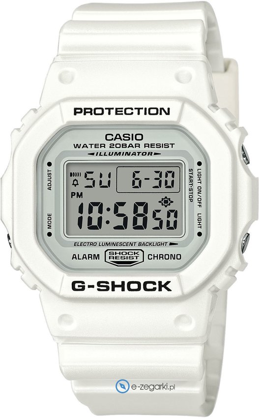 Zegarek DW-5600MW-7ER marki Casio to elegancki zegarek naręczny męski, który posiada pomysłowe rozwiązania i funkcje. Model ten zalicza się do serii Casio G-Shock. Wysokiej trwałości cyferblat zegarka ozdobiono szarym kolorem. Godzina przedstawiona jest w sposób cyfrowy co intuicyjnie pozwala ją odczytać. Koperta w barwach koloru białego szeroka jest na 42.8 mm oraz ma grubość 13.4 mm - w kształcie prostokątnym.