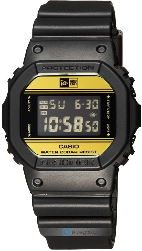 Zegarek męski DW-5600NE-1ER G-SHOCK x NEW ERA marki Casio to stylowe połączenie funkcjonalności a także modnego wzornictwa. Model ten jest z kolekcji Casio G-Shock. Wysokiej jakości tarczę zegarka ozdobiono szarym kolorem. Zegarek ten pokazuje godzinę w formacie cyfrowym dzięki czemu odczyt jest intuicyjny. Koperta w barwach koloru czarnego szeroka jest na 42 mm oraz ma grubość 13.4 mm - posiada prostokątny kształt.