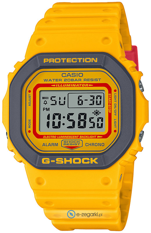 Zegarek męski DW-5610Y-9ER marki Casio to idealne połączenie funkcjonalności i ciekawego wzornictwa. Model ten w gamie innych zegarków tego producenta występuje w serii Casio G-Shock. Stylu nadaje wysokiej jakości cyferblat w kolorze żółtym. Aktualna godzina pokazywana jest w sposób cyfrowy co bez trudu pozwala ją odczytać. Koperta w odcieniach koloru szarego szeroka jest na 44 mm oraz ma grubość 14 mm - wyróżnia się prostokątnym kształtem.